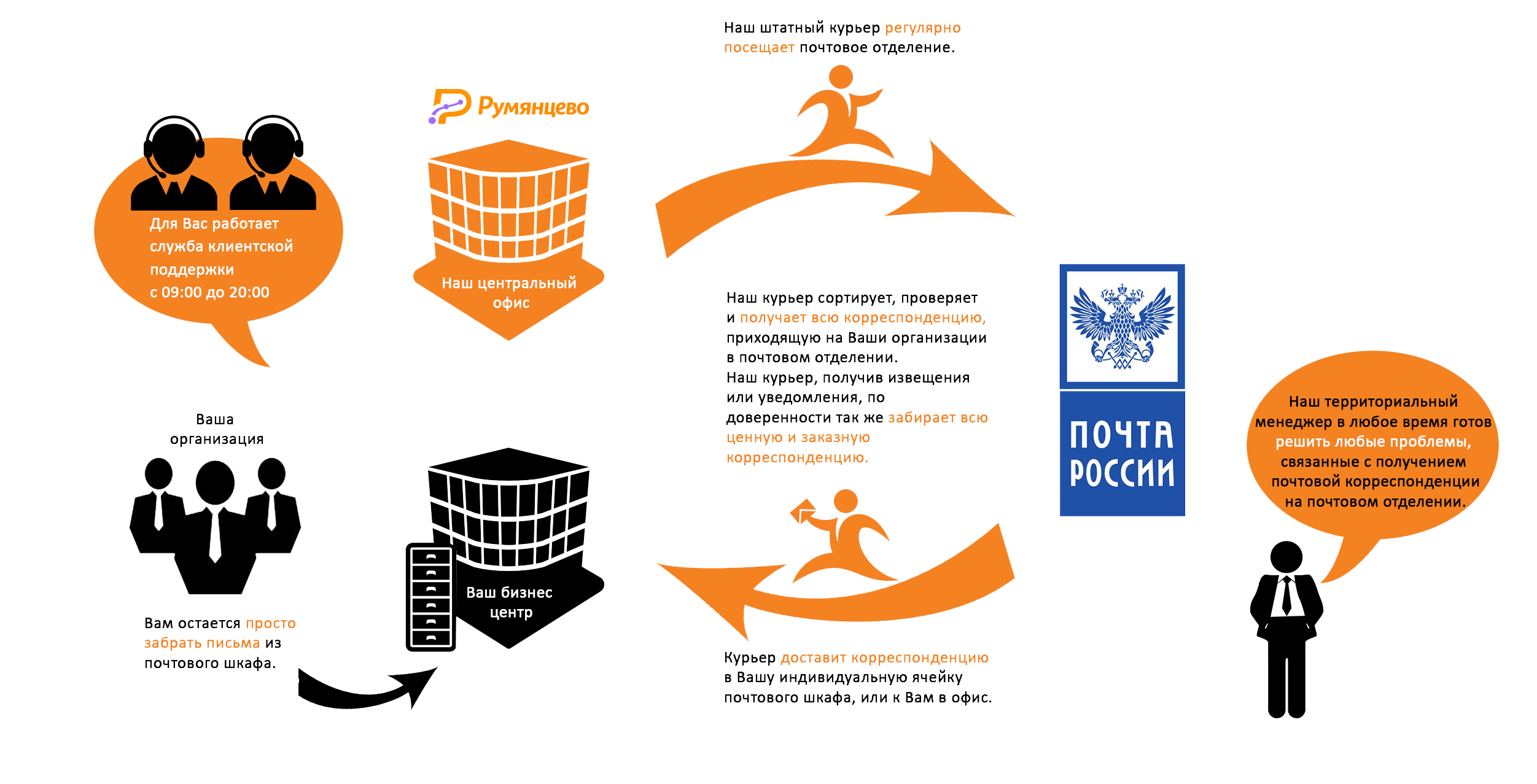 Группа компаний «Румянцево» предоставляет весь спектр почтовых и курьерских услуг для юридических лиц с 2008 года. Мы помогаем нашим клиентам эффективно использовать самый главный ресурс - время. Мы берем на себя все вопросы, связанные с подготовкой, получением, доставкой корреспонденции. Удобства работы с нами уже оценили более 3000 наших клиентов.